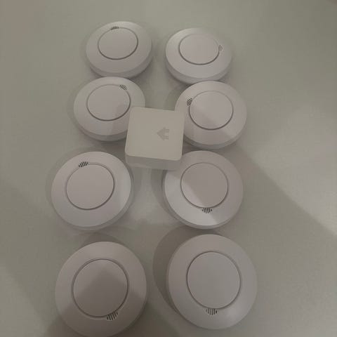 Varslerne/hub er ikke brukt men eskene er åpnet og har ligget på vent her en stund, så medfølgende batterier bør kanskje byttes før montering.