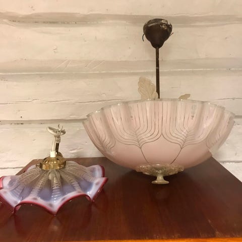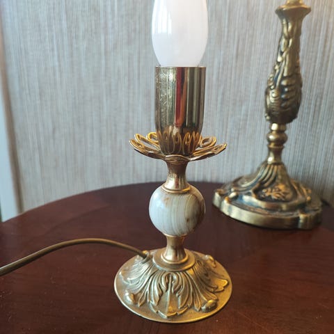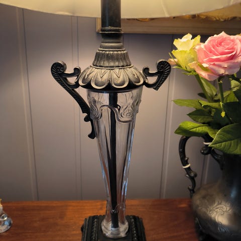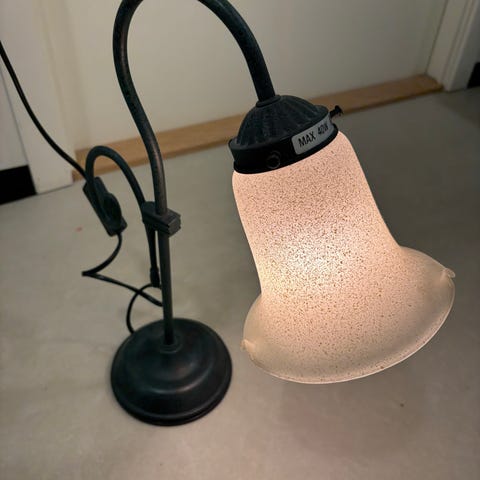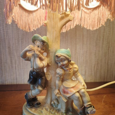 Selger pen, vintage bordlampe. Lampen har nydelig glass skjerm og med figur på foten.