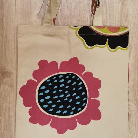 Handlenett fra Gudrun Sjödén i solid bomullsstoff fra 2018. Nettet er flerfarget blomsterprint. Er minimalt brukt og fremstår som nytt. Du kan lett sy dette om til et putetrekk om du ønsker deg en pute i livlige farger.