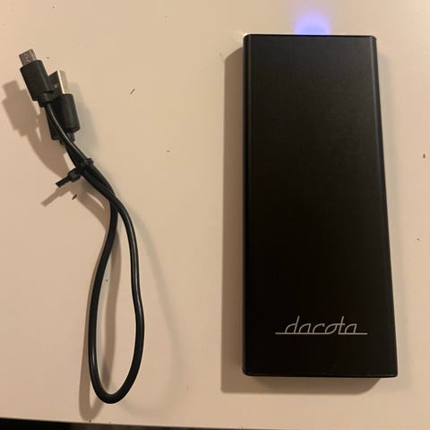 Selger en Dacota Platinum powerbank på 10 000 mAh, pent brukt og fullt funksjonell. Støtter både USB-C Power Delivery (PD) og Quick Charge (QC) for rask lading av mobil, nettbrett og andre enheter.