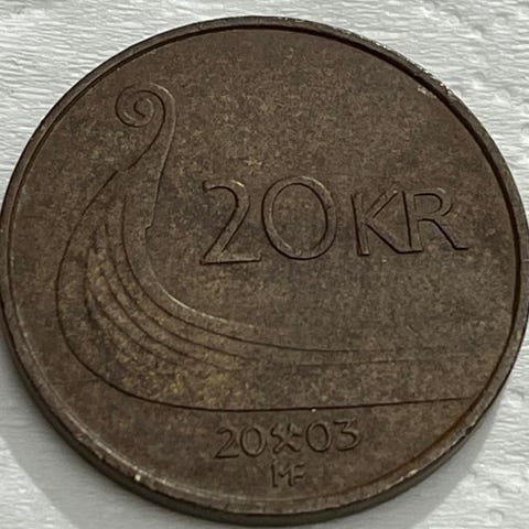 Mynten har en glanset overflate og viser et vikingskip på den ene siden og kongens profil på den andre. Ved siden av ligger en vanlig 20 kroning til sammenligning.