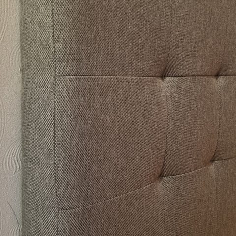 Pent brukt sengegavl. Litt dårlig lys men den er i en pen gråbeige farge. Kanskje mer grå en beige. 142 cm bred ca og 128 cm høy. 7-8 cm tykk.