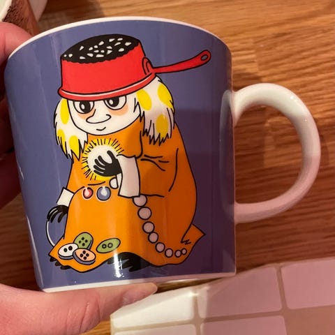 Arabia Mummitrollet krus med blå og gul farge. Snorkfrøken og Mummi motiv. Omtrent ikke brukt. Bare stått i skap