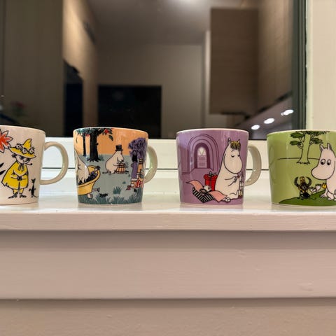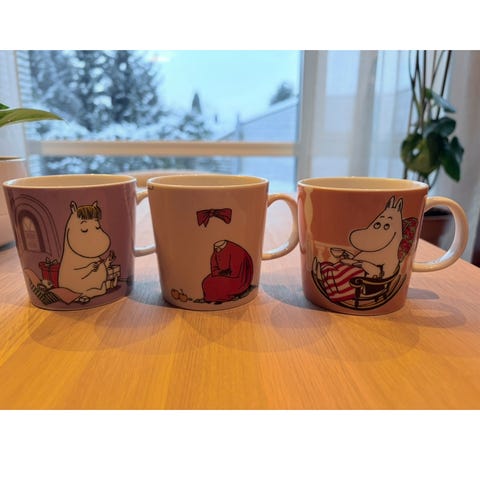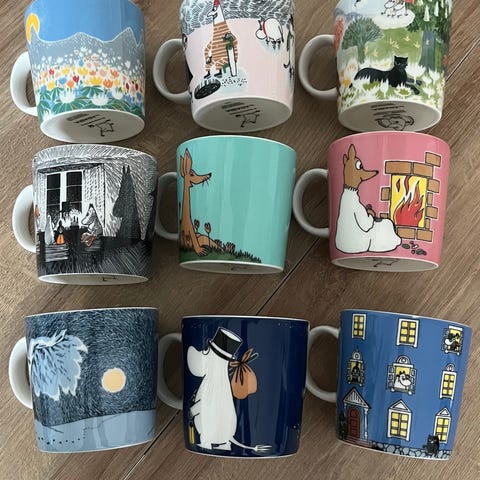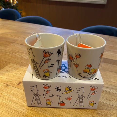 400kr pr stk Arabia Mummitrollet Krus med blå og gul farge