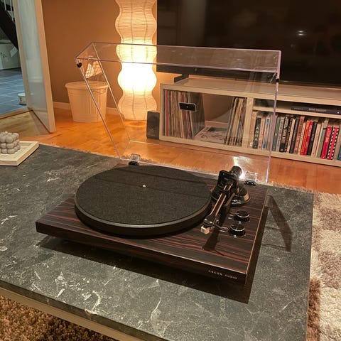 Argon platespiller med beskyttelseslokk i klart materiale. Designet for avspilling av vinylplater.