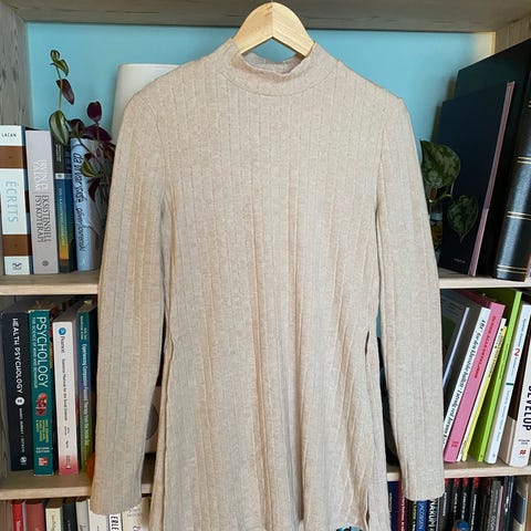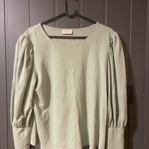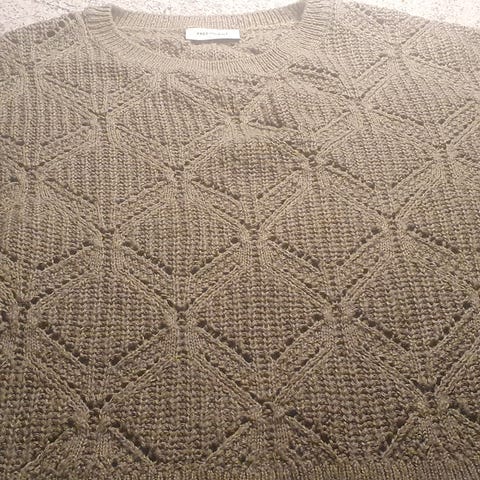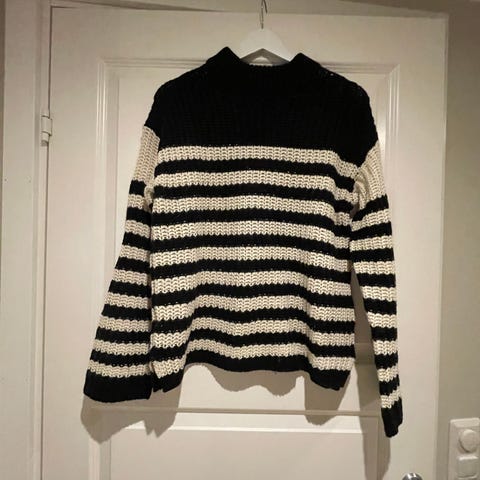 Fin genser fra Freequent med fint bølgemønster i mørkblå, blå, lysblå og beige. Brukt ein gong, men blei litt kort for meg.