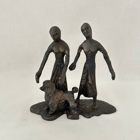 Dekorativ pynte figur fra Italia, som viser en mann og en kvinne sittende sammen under et tre. Skulptur er i fargene blå, mørk turkis og bronse. Usikker på materialet den er laget av, mulig keramikk, gips eller polyresin. Italiensk ut fra det jeg finner på nett.