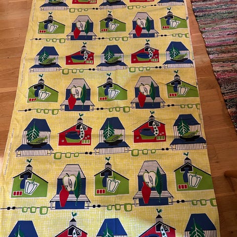 Det er 2 deler, 1 måler 108 x 204 cm, og 1 108 x 126 cm. 70-tallet? Har funnet ett par merker.