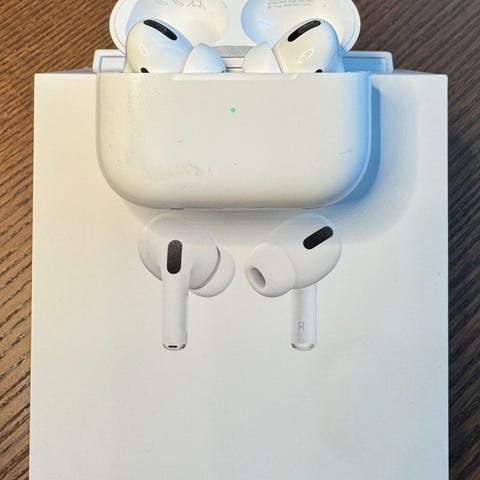 AirPods Pro generasjon 1 (2021). Boks, ladekabel (ubrukt) og to ekstra par silikonpropper (ubrukt) følger med.