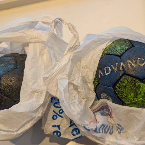 Pent brukte håndballer selges hver for seg for 100,- pr stk eller 250,- for alle 3