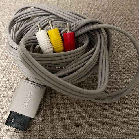 Original Nintendo AV-kabel med kompositt-tilkoblinger. Kabelen har tre fargede plugger: gul (video), hvit (venstre lydkanal) og rød (høyre lydkanal). Passer til Nintendo-konsoller som bruker denne typen tilkobling.