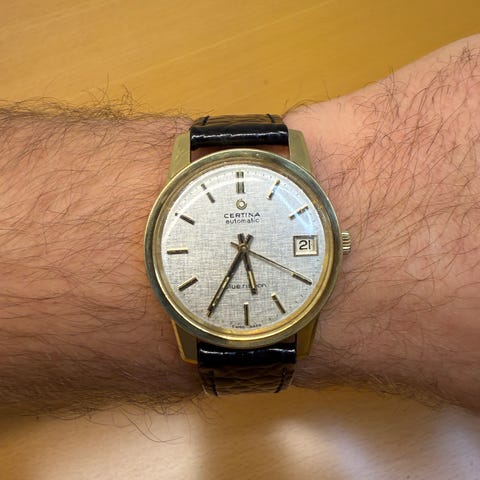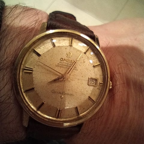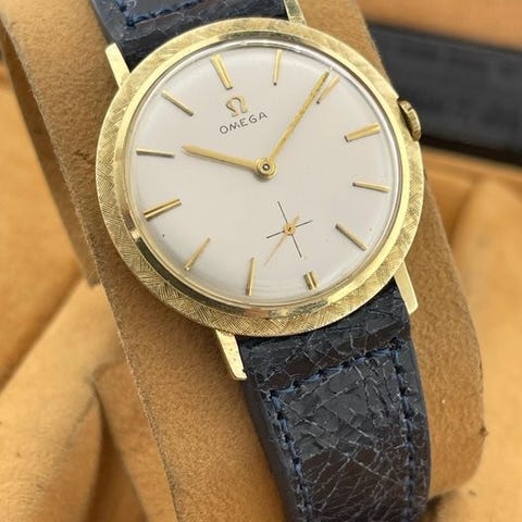 Vintage Omega Tank, 14K Gull kasse, caliber 620, manuell. Holder tiden fint. Klokken har en 22 mm rem, så relativ bred kasse, passer til man og dame. Baklokk på kassen er gravert. Plexiglass er fint, skive har patina.