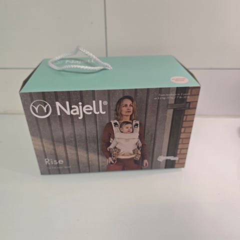 Najell Rise bæresele i svart farge. Bæreselen er designet for å gi støtte og komfort ved bæring av barn. Den har justerbare stropper og polstring for tilpasning til brukerens behov.