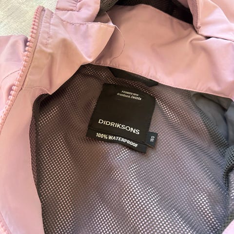 Jakken har lomme for skikort på ermet og snøskjørt inni. Ingen synlig slitasje.
