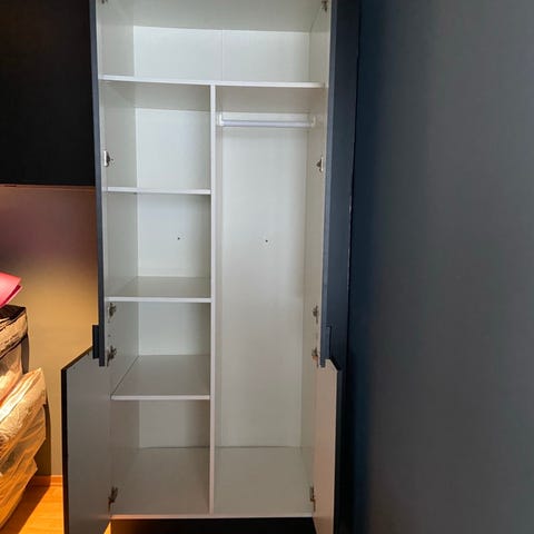 Gis bort ett pent brukt skap pga. flytting. Har noen slite merker. Dørene har hengsler på baksiden, så de kan monteres på igjen. Skapet blir demontert. Hentes så fort som mulig