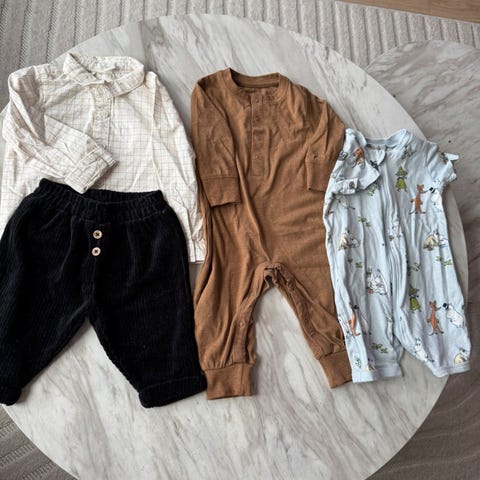 Liten klespakke til baby, body x2 og bukse x2 er str 62, strømpebukser str 56.