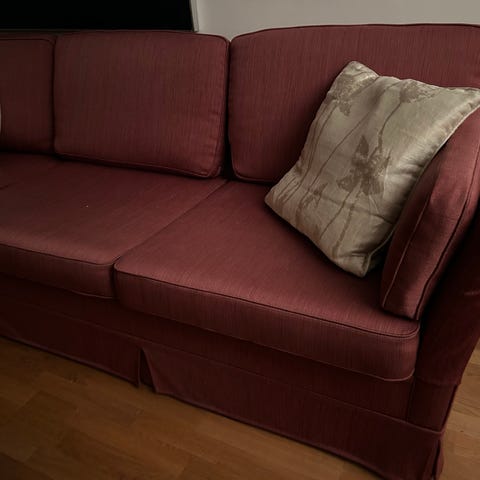 Blå sofa med puter og trekk fra Ål systugu