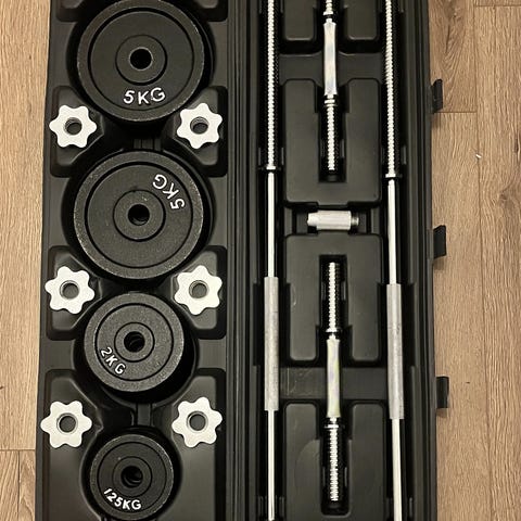 Vekstangsett med totalt 20,5 kg vekt. Inkluderer vektplater i blå og svarte farger med håndtak for enkel håndtering. Passer til styrketrening og generell trening.