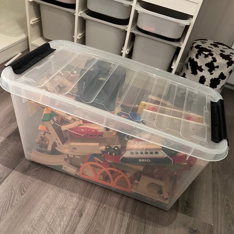 Selger en stor og innholdsrik trejernbane fra BRIO med tog, skinner og masse tilbehør. Ink kasse med hjul om ønskelig.