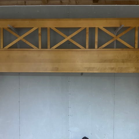 Sengegavl i mangotre med rillet mønster foran. Avrundet jern på baksiden som hindrer trematerialet fra å vri seg eller sprekke. 3 stk. nøkkelhullsfester bak for veggoppheng. Mål: Bredde 183 cm, høyde 60 cm, dybde 2,5 cm.