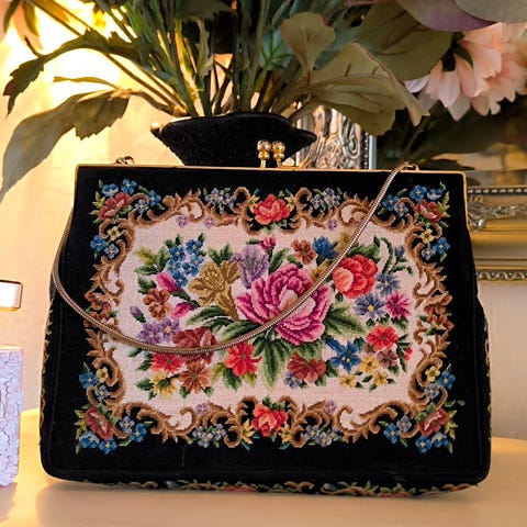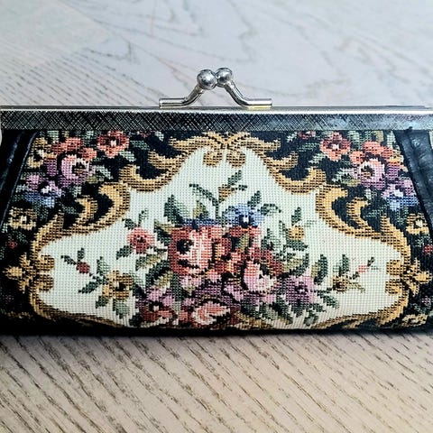 Selger en elegant og tidløs vintage clutch / sminkepung i gobelin (tapestry) med rikt, vevd blomster mønster og dekorative detaljer. Klassisk design med eksklusivt uttrykk som gir en luksuriøs følelse.