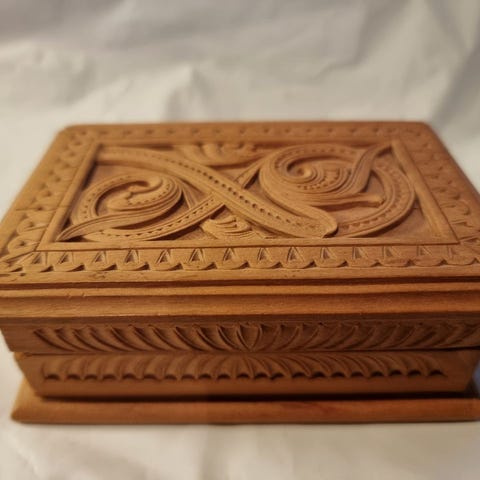 Et fantastisk håndverk der alt er skåret ut av samme trestykke. Rikt dekorert. Umulig å forestille seg hvor lang tid dette har tatt - veldig imponerende.