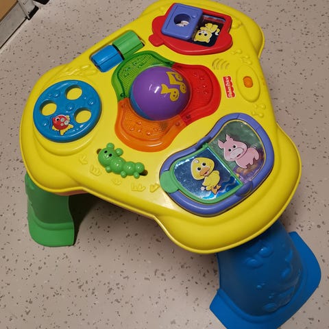 Aktivitetsbord for barn med flere lekefunksjoner. Bordet har grønne ben og en fargerik lekeflate med ulike elementer som kan trykkes på og beveges. Designet for å stimulere barns motorikk og sanser.