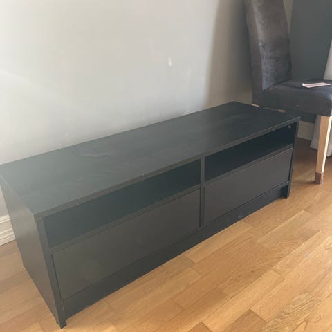 Tv benk med en skuff og hyller.