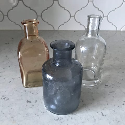Delrasjonsflasker i klart glass med kork. Settet består av tre flasker med ulikt mønster og design. Flaskene kan brukes til dekorasjon eller oppbevaring av små mengder væske.