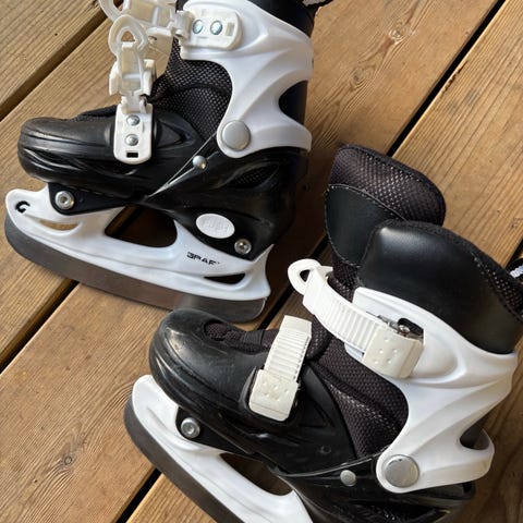 Ukjent Ishockeyskøyter for barn i størrelse 29. Skøytene er i svart med hvite og røde detaljer og har snøring for justering. Godt brukt, men tåler flere sesonger.