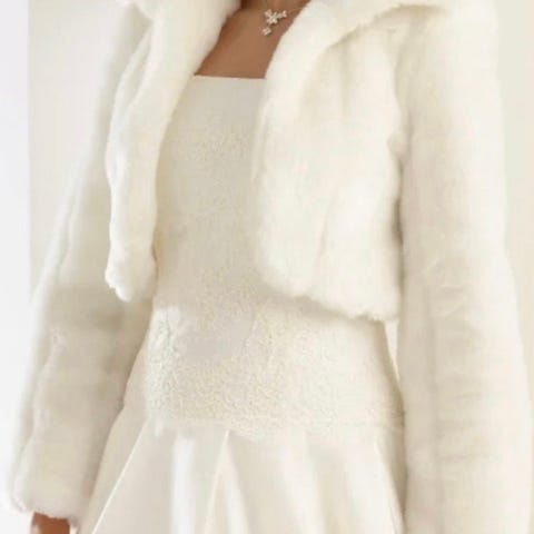Genser til brud fra Bianco Evento. Jeg kjøpte den brukt (ubrukt), og jeg fikk heller ikke bruk for den grunnet pent vær. Derfor kun prøvd på.