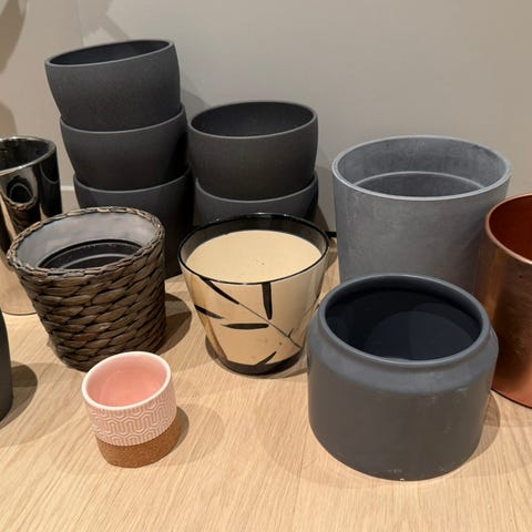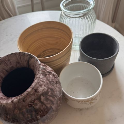 Selger diverse vaser og potter.