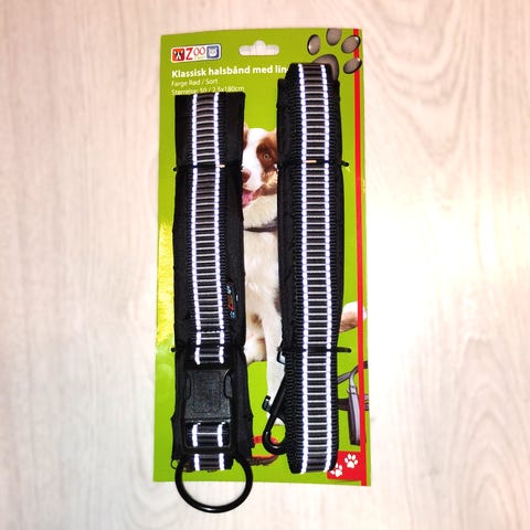 Halsbånd og tilhørende bånd til hund i mykt slitesterkt materiale. O-ring til feste av bånd og navnetag. Egnet for turer i all slags vær.