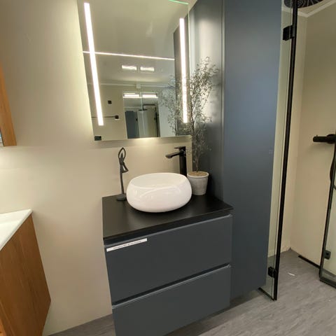 Servantskap frå Korsbakken bad selges frå rørleggerbutikk som er avvikla. Ein veldig liten skade nederst i hjørne i bakkant av skapet. Str 120 cm. Følger med håndtak i krom. Selges uten servant. Farge soft cashmere