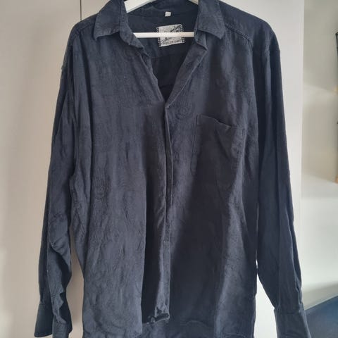 Dette er en vintage skjorte i en veldig god viscose kvalitet. Stoffet er har litt tyngde, noe glans og faller veldig fint. Jeg har selv kjøpt den secondhand, men er ikke brukt av meg fordi den rett og slett ble for stor for meg. Fin skjorte til også å bruke som "jakke" ved å bare kneppe 1 el 2 av de øverste knappene. Mønster i sort/beige/myk gul