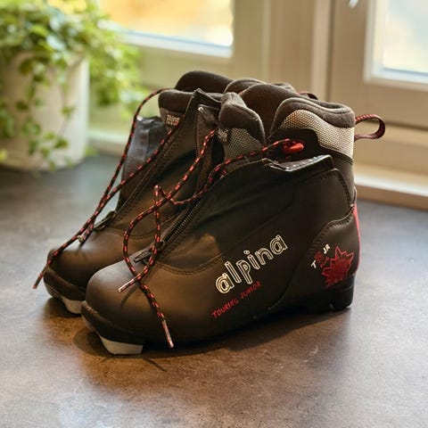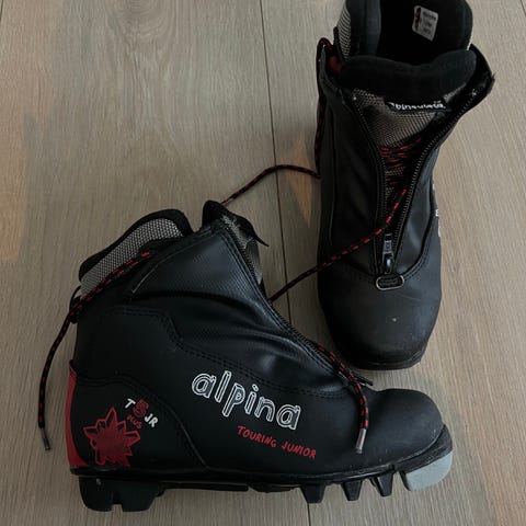 Alpina Touring Junior langrennssko i størrelse 36. Skoene har en kombinasjon av materialer med svart og hvit farge, og er designet for langrenn med god støtte og feste.
