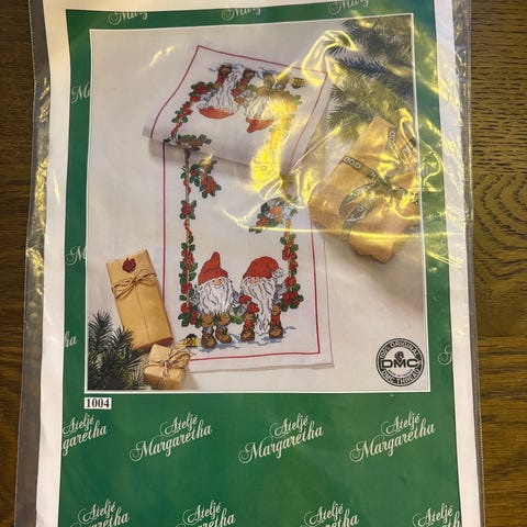 Broderisett for duk med mål 32 x 32 cm. Inkluderer hvit duk med julemotiv i rødt, grønt og svart, samt broderigarn i flere farger. Egnet til håndarbeid og dekorasjon.