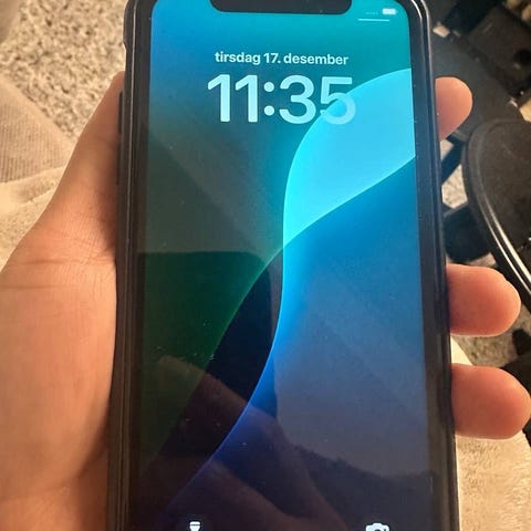 Svart Apple iPhone 11 mobiltelefon med 128 GB lagringskapasitet. Telefonen er godt brukt, men alt fungerer som vanlig. 77% batterikapasitet. Det er noen små merker nede på sidene, men de er nesten ikke synlige og har ingenting å si for funksjonen til telefonen (kan også dekkes opp med deksel)