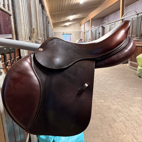 Salen er pent brukt, med normal kosmetisk slitasje i setet, men fullt funksjonell og godt ivaretatt. Mykt skinn og god støtte uten å låse rytterens posisjon.