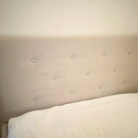 Nydelig lysegrønn/beige sengegavl. Velourstoff. 145 cm bred, men fungerer utmerket til 160 cm seng. Skrus primært inn i vegg med seks skruer. Solid, men enkelt opplegg. Kan alternativt settes opp bak seng.