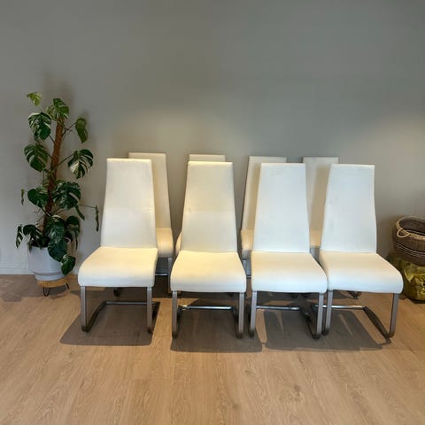 6 spisestue stoler, kjøpt på Møbelringen for 4-5 år siden selges rimelig. Brun/mokkafarge, imitert skinn med sorte metallben. Gode å sitte i. Noe bruksslitasje, et par flekker, men hele. Kom gjerne å se de. 900 kr for alle 6 (150 kr stk)