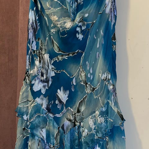 Kjole brukt bare en gang i bryllup. Kjolen går helt ned til gulvet. Det står UK størrelse 10, som ser ut til å være EU størrelse medium.