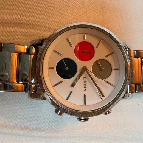 DKNY - Vintage armbåndsur/kronograf i rustfritt stål, modell NY1125 – her med stållenke, men pent brukt sort lærrem medfølger. Batterier må skiftes!