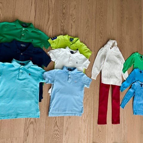 Klespakke med diverse merkeklær: lacoste, polo Ralph Lauren, champion, petit bateau etc. alle klærne er pent brukt, bortsett fra en jeans fra Zara som har et lite hull på kneet.