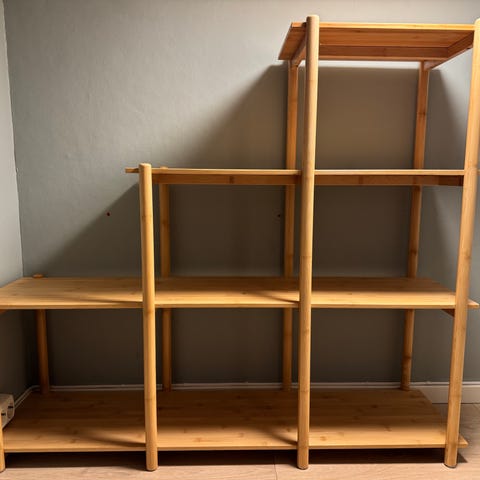 Ivarhylle fra Ikea med 4 hyller, hvitpigmentert furu. Hyllen har en enkel konstruksjon med tverrstag bak for stabilitet.