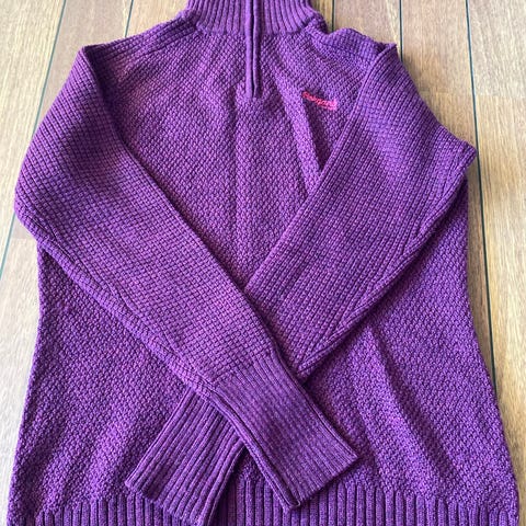 Bergans høyhalset zip genser i størrelse L for dame. Genseren er laget av merinoull og har en rød farge.