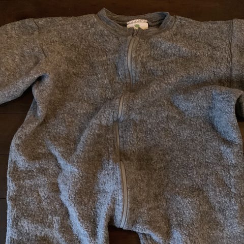 Nøstebarn grønn ulldress i størrelse 80, unisex, laget av merinoull. Plagget er egnet for barn og laget i merinoullmateriale som gir varme og komfort.