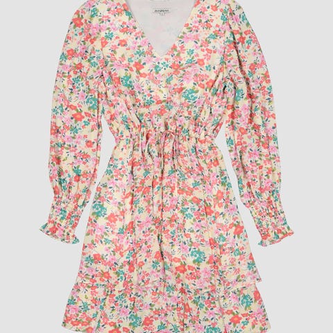 Kjole i lett småblomstret viskose med fôr i kroppen og lang pufferm med smal knappet mansjett. Kjolen har glidelås i ryggen bred elastisk vaffelsøm i livet og utskrådd skjørt med kappe nederst. Logobadge nede på siden og og lengde ca til leggen. (Modellen er 179 cm høy )
