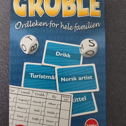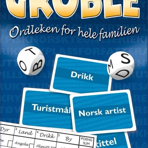 Gruble Brettspill for hele familien med kort, terninger og poengark. Spillet inkluderer kategorier som drikk, turistmål og norsk artist. Egnet for spillere over 8 år.