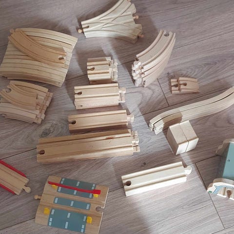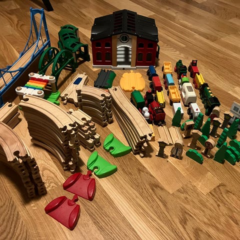 70+ skinner (BRIO + IKEA, fullt kompatibelt): rette, buer, høyder, broer, kryss m.m.